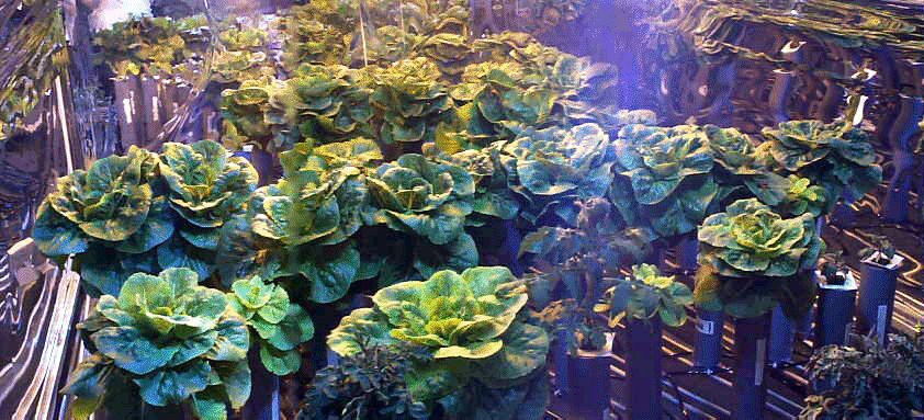 Wide view of a Test Bed 2 lettuce crop. Colour is distorted in areas due to high light levels and splicing