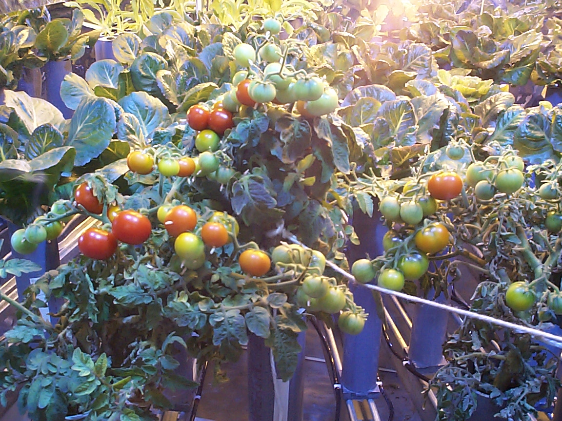 Wide view of a Test Bed 2 lettuce crop with cluster cherry tomatoes in background. (note: picture has been spliced to obtain larger view)
